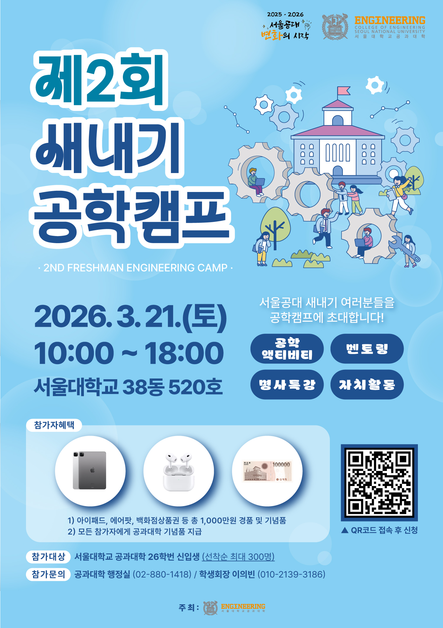 2026학년도 「 제 2회 새내기공학캠프 를」 개최하오니 많은 신입생들이 참가하여 동문 멘토들과 함께