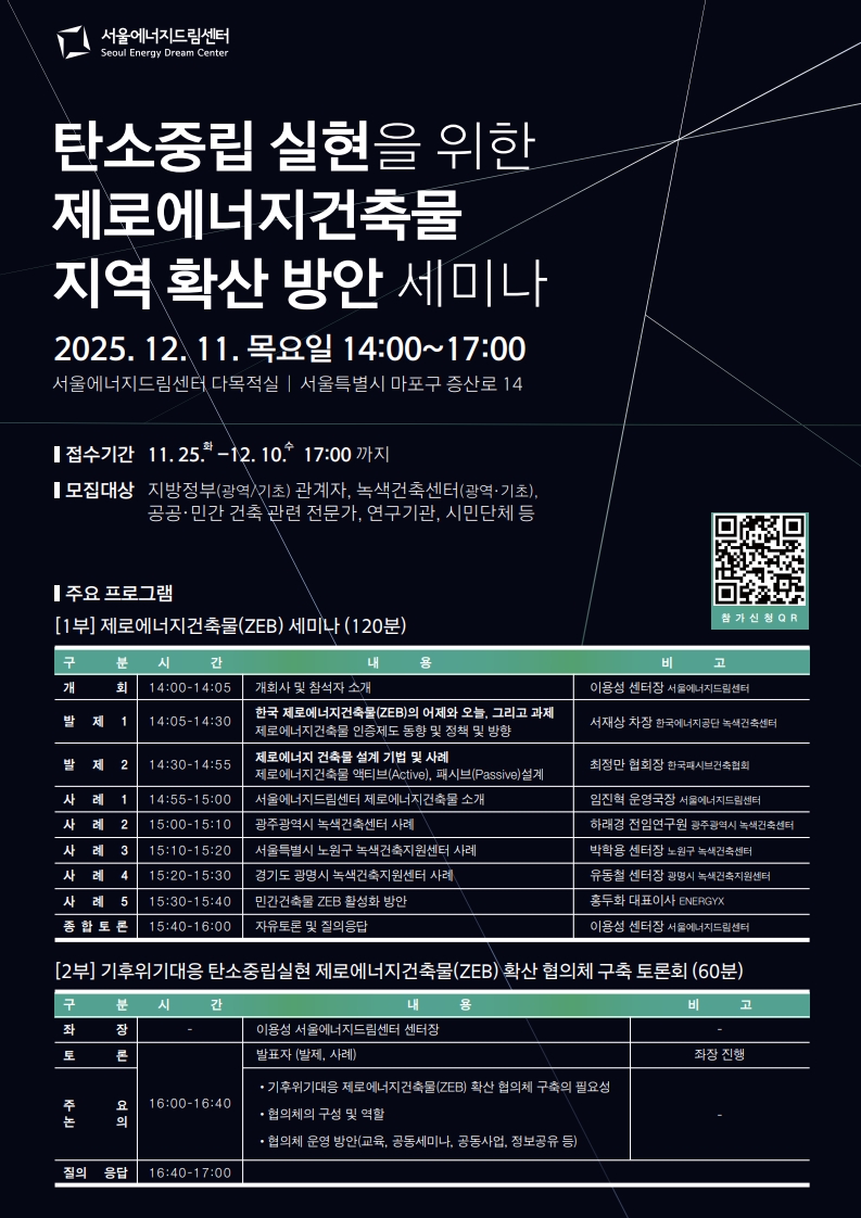 이에 아래와 같이 「기후위기대응 탄소중립실현 제로에너지건축물 지역 확산 세미나」를 개최하여 관련 정책 방향, 기술 동향 및 추진 현황을 공유하고 기관 간 협력 기반을 마련하고자 하오니 적극적인 참여 바랍니다.
