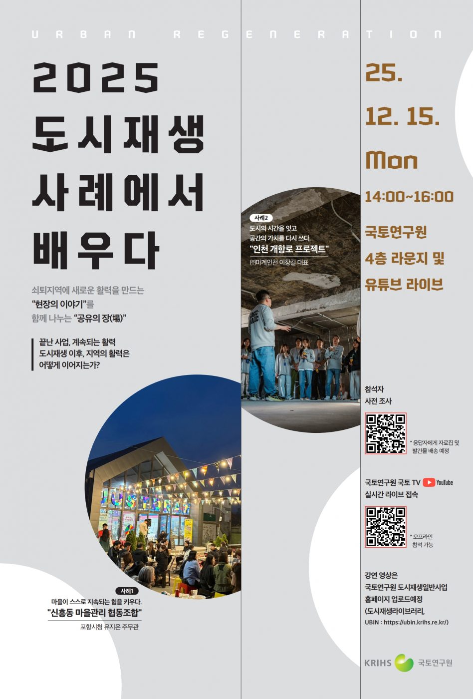 국토연구원 도시재생, 정비연구센터에서 쇠퇴지역에 새로운 활력을 만드는 "현장의 이야기"를 함께 나누기 위한 "도시재생 사례에서 배우다" 행사를 아래와 같이 개최합니다.
