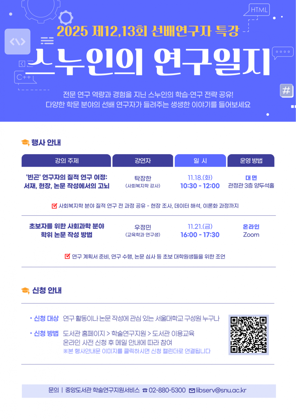 제12,13회 선배 연구자 특강 「스누인의 연구일지」 개최 안내