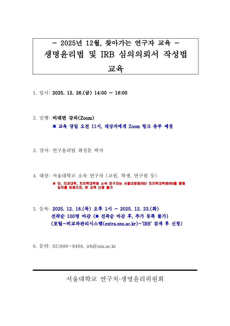 2025년도 제6차 「찾아가는 연구자 교육: 생명윤리법 및 IRB 심의의뢰서 작성법」 교육 안내