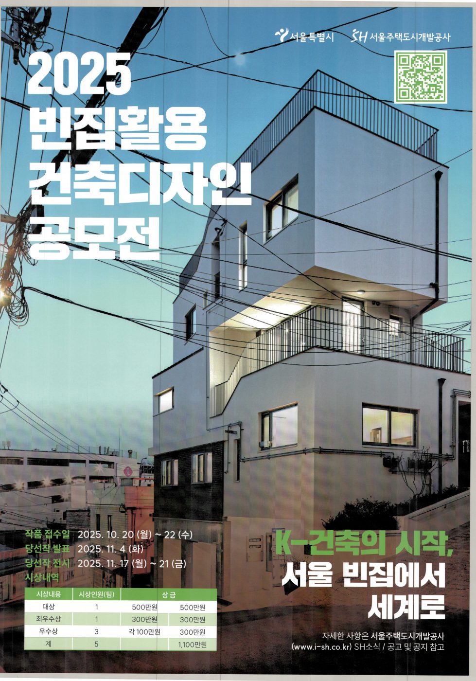 서울특별시 및 SH서울주택도시개발공사에어 아래 포스터와 같이 2025 빈집활용 건축디자인 공모전을 개최한다고 합니다.