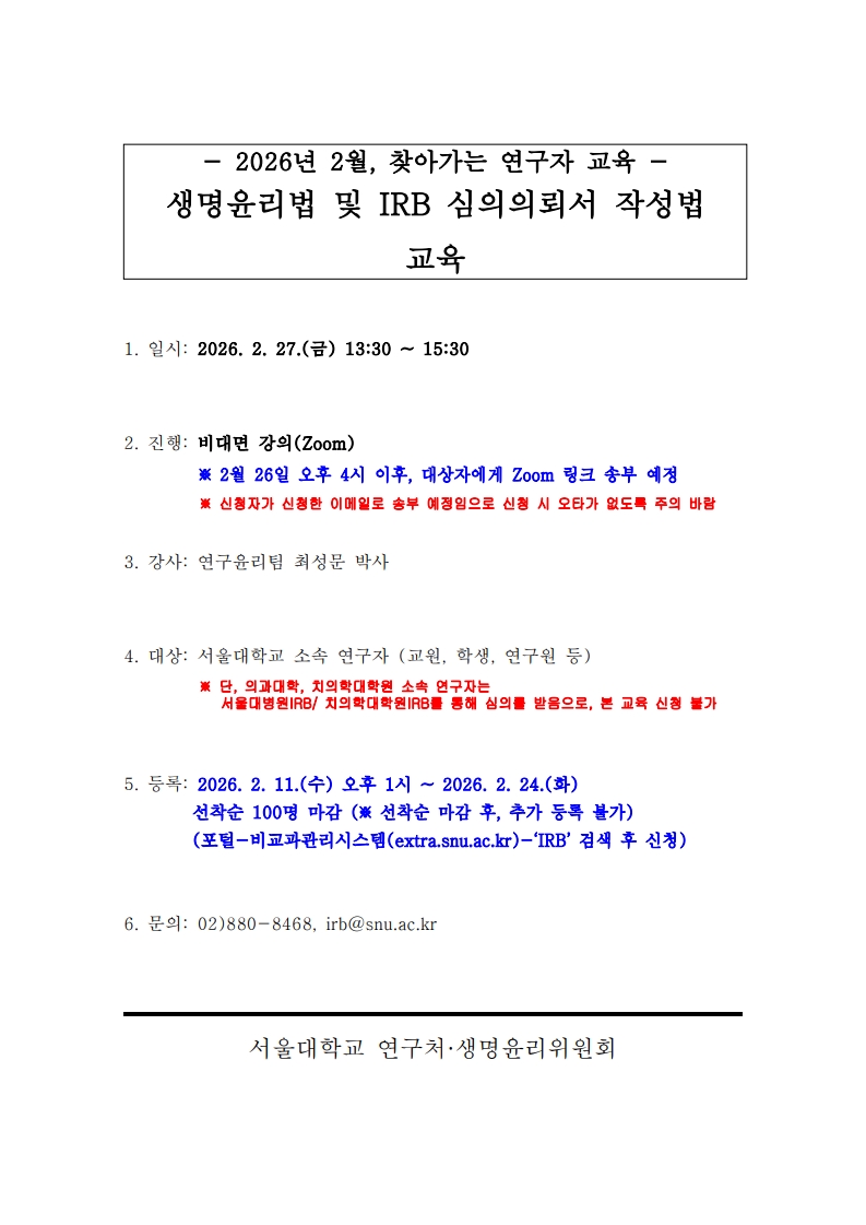 2026년도 제1차 「찾아가는 연구자 교육: 생명윤리법 및 IRB 심의의뢰서 작성법」 교육 안내