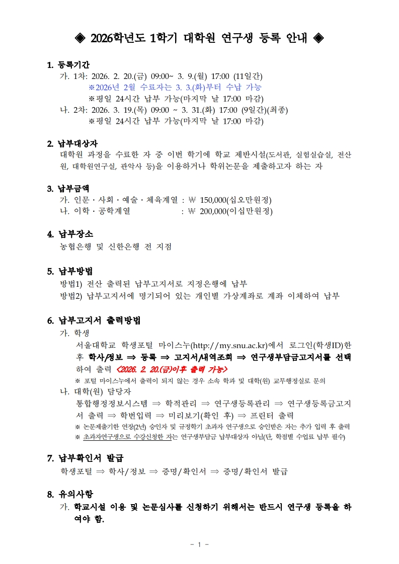 2026학년도 1학기 대학원연구생 등록 일정 알림