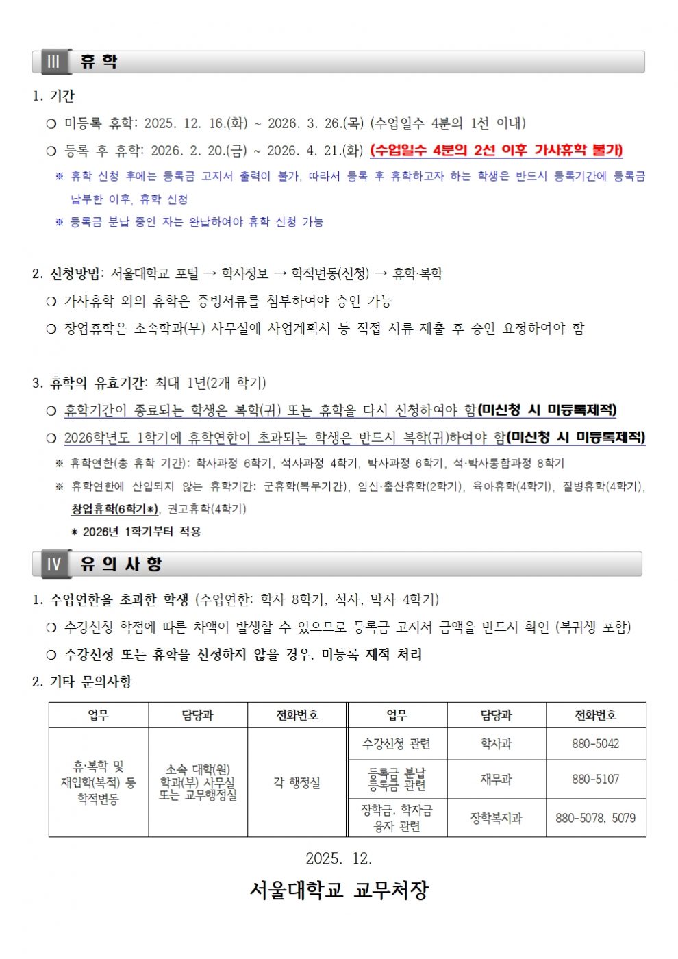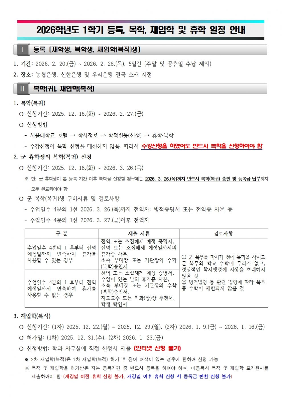 2026학년도 1학기 등록, 복학(귀), 재입학(복적) 및 휴학 일정 안내