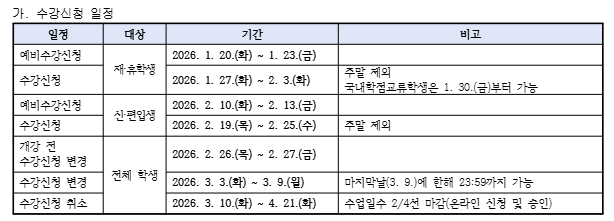 2026학년도 1학기 수강신청 일정을 안내드리니, 기간에 맞추어 수강신청 하시기 바랍니다.