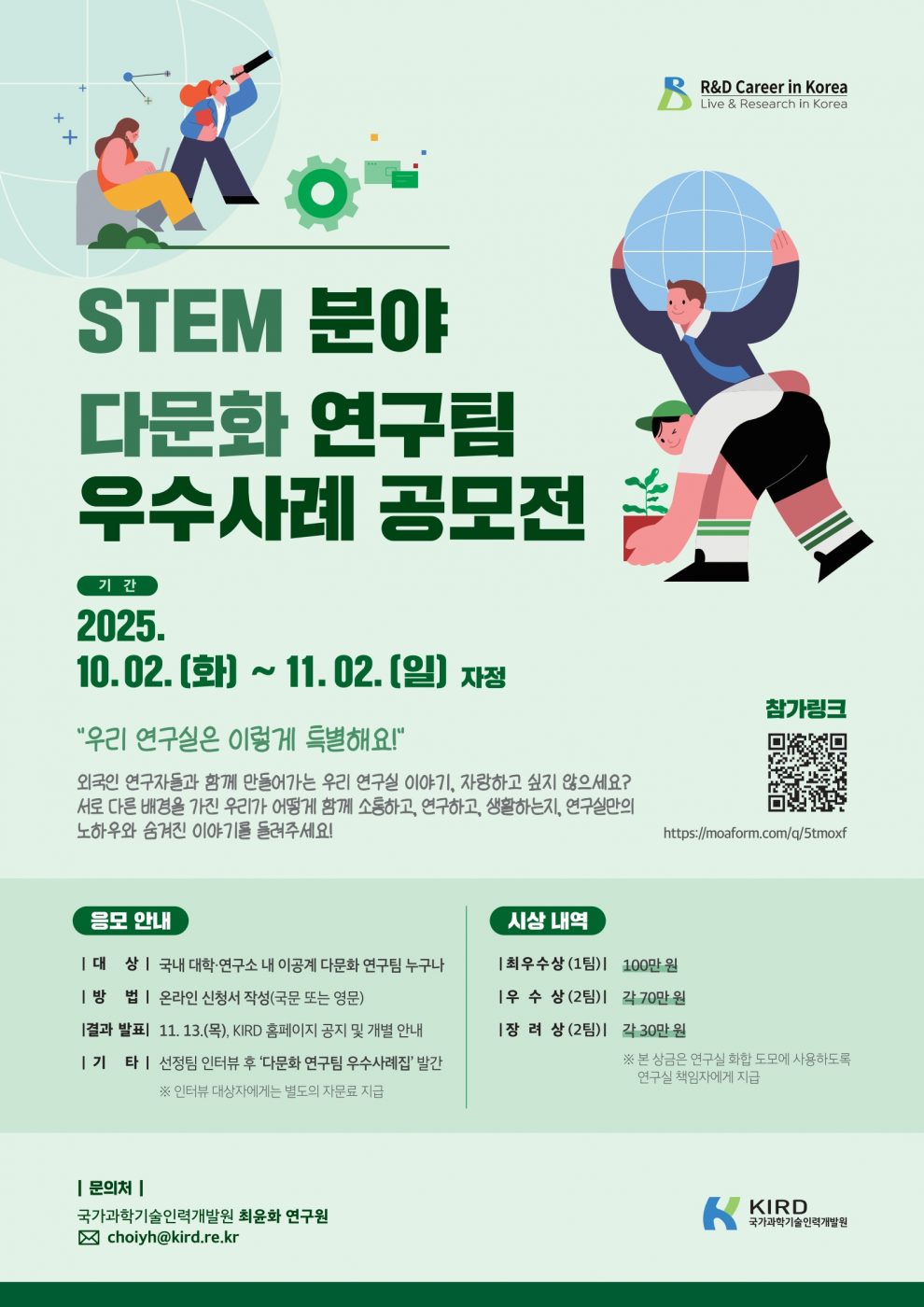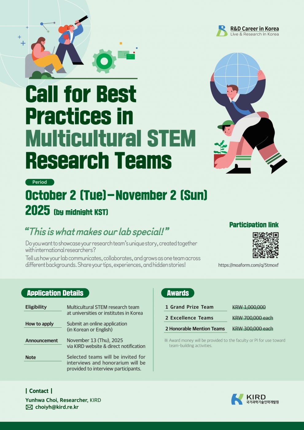 The Korea Institute of Human Resources Development in Science and Technology(KIRD) is hosting the Best Practices Contest for Multicultural STEM Research Teams to promote collaboration and communication within multicultural research groups in Korea. The contest aims to discover and share successful teamwork stories, communication strategies, and management know-how from diverse research environments.